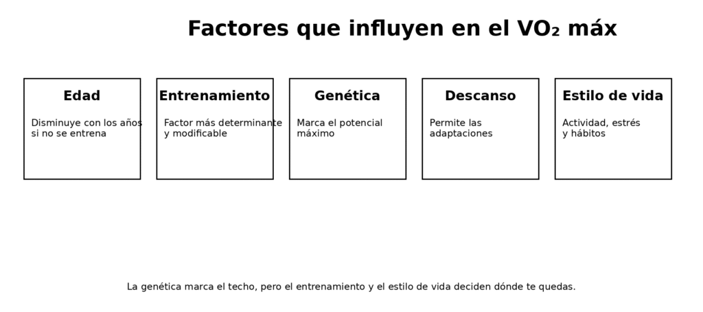 El VO₂ máx está determinado por una combinación de factores genéticos y ambientales. La genética marca un techo teórico, pero el estilo de vida y el entrenamiento determinan en gran medida dónde nos situamos dentro de ese rango.